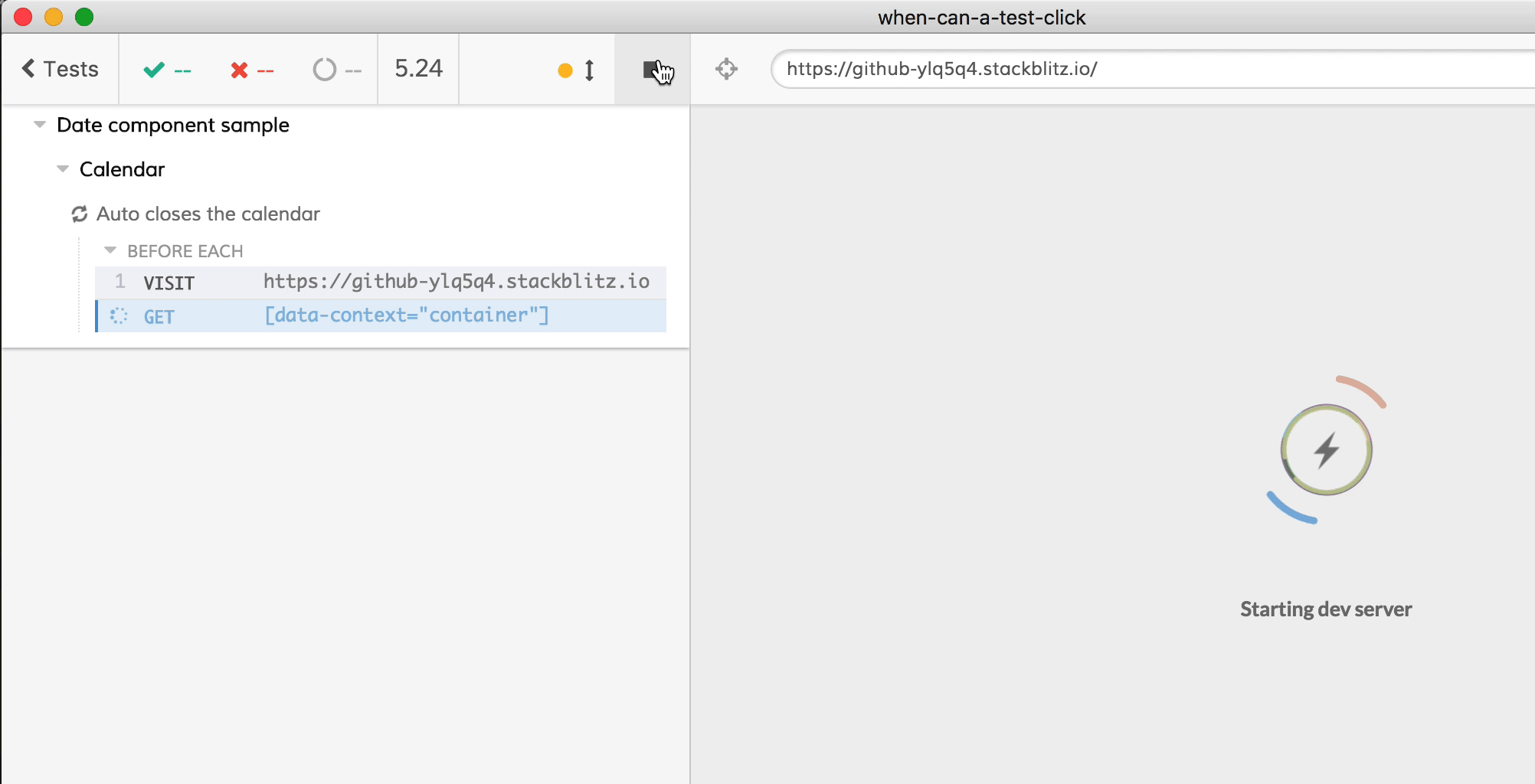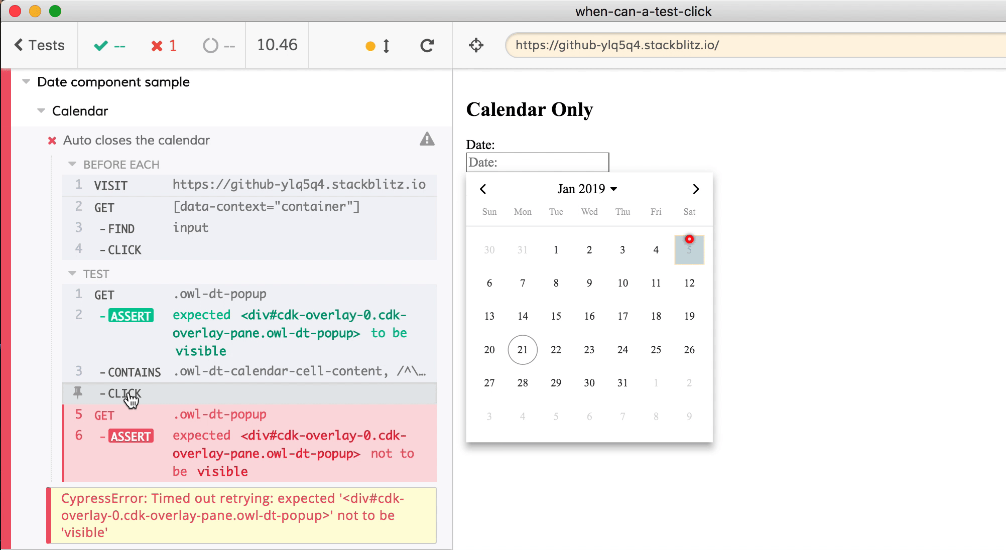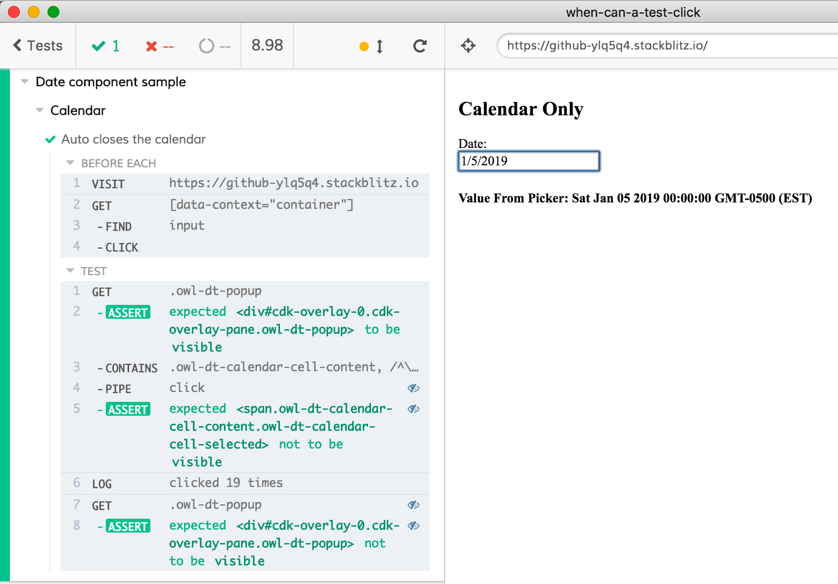 The problem is straightforward once we walk through how Cypress works. Let’s use the web application at https://github-ylq5q4.stackblitz.io as an example. This application has an input element that opens a calendar modal when you click on the input. When you click on any date in the calendar model, the modal closes and the date you picked appears as the value of the input element. Here is how it works when I use it in the browser.