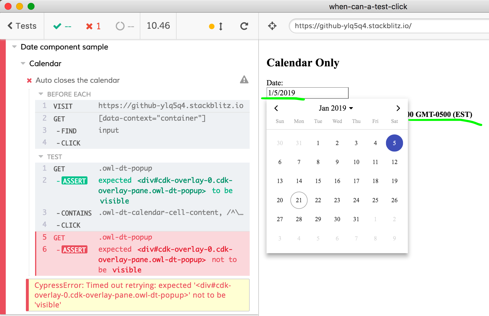 And just to finish describing the problem: if we click on the date AFTER the test has finished, it goes away. The application does behave correctly when an actual user clicks in the web application, even if it is running inside of Cypress.
