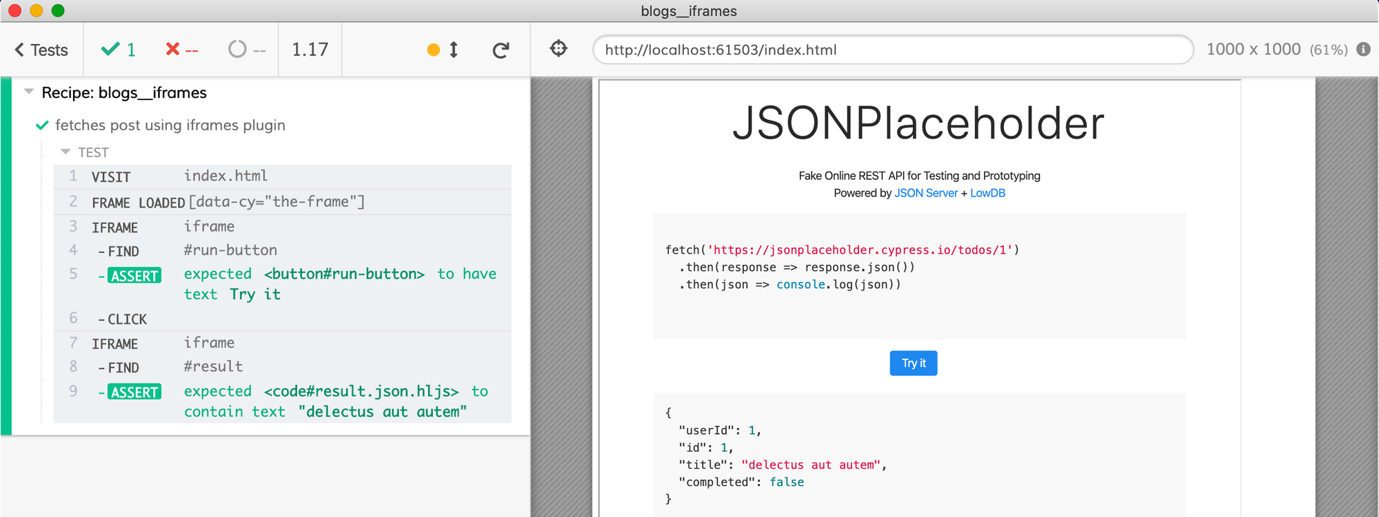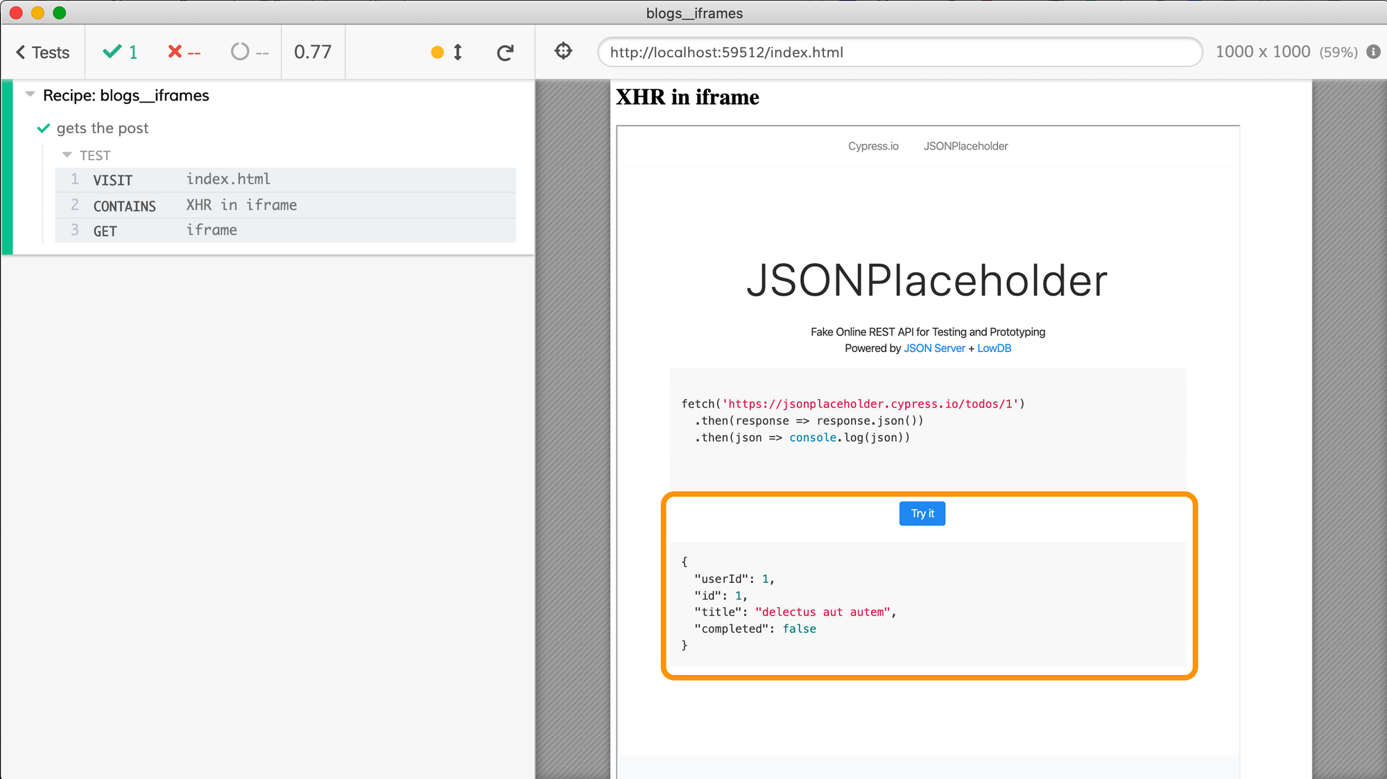 cy.iframe().find('#result').should('include.text', '"delectus aut autem"')