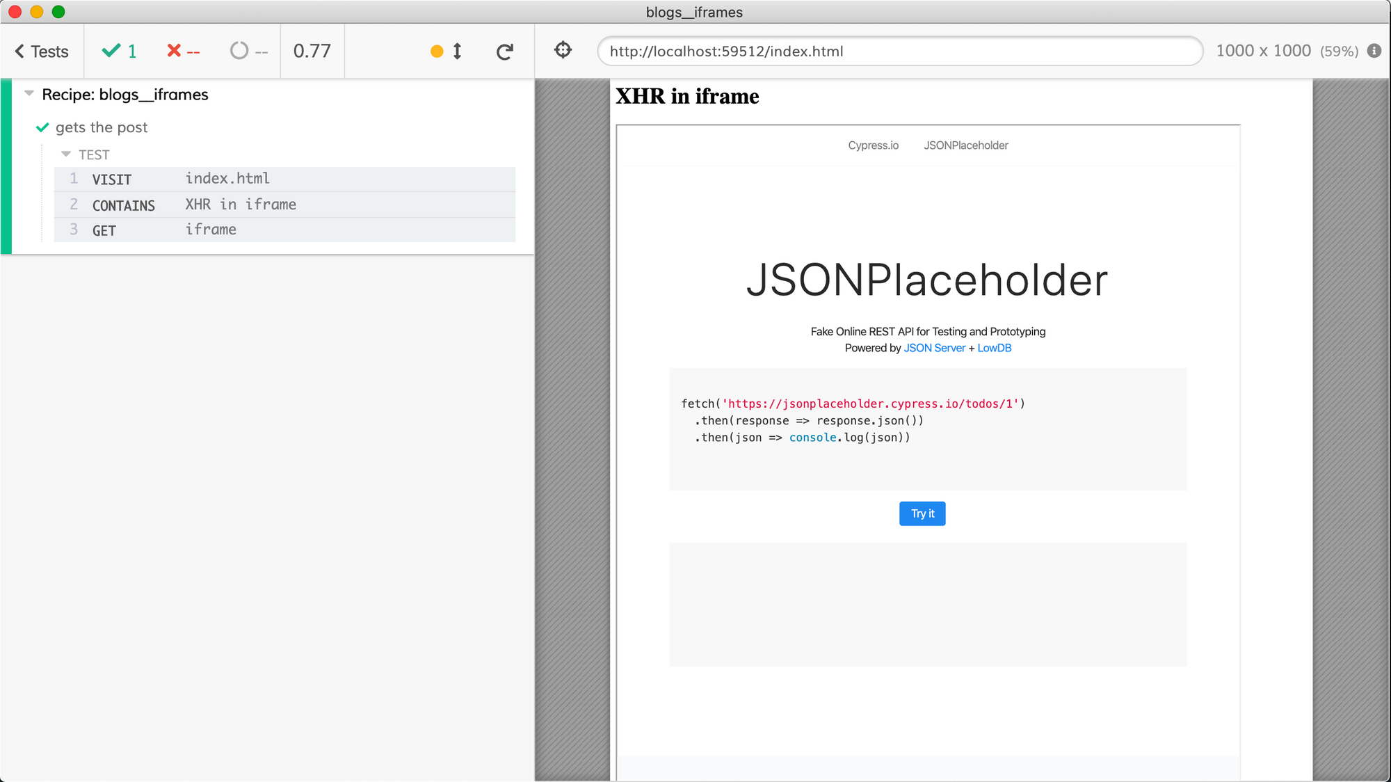 If we manually click the button "Try it", the iframe does indeed fetch the first post.