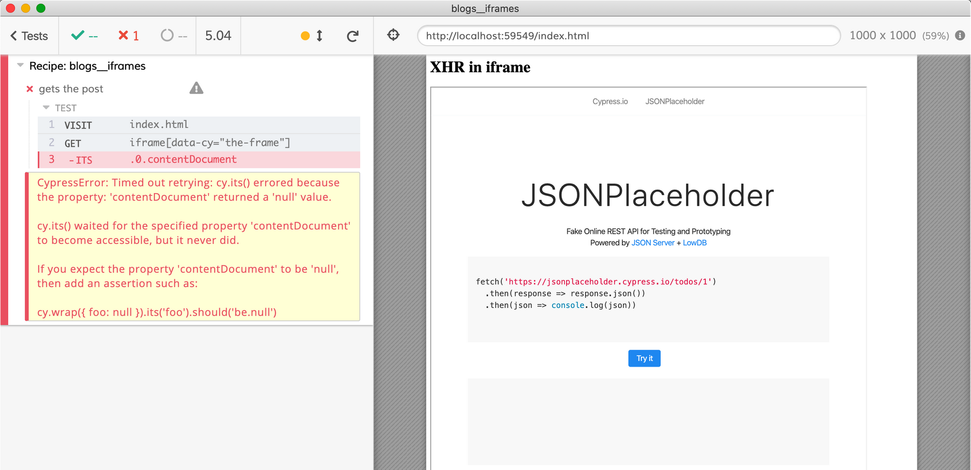 Our problem is that our test runs under the domain localhost (you can see it in the browser's url), while the button and the iframe itself come from the domain jsonplaceholder.cypress.io. Browsers do not allow JavaScript from one domain to access elements in another domain - that would be a huge security hole. Thus we need to tell our browser running the tests to allow such access–after all, this is our test, we control the application and know that the 3rd party iframe it embeds is safe to use.