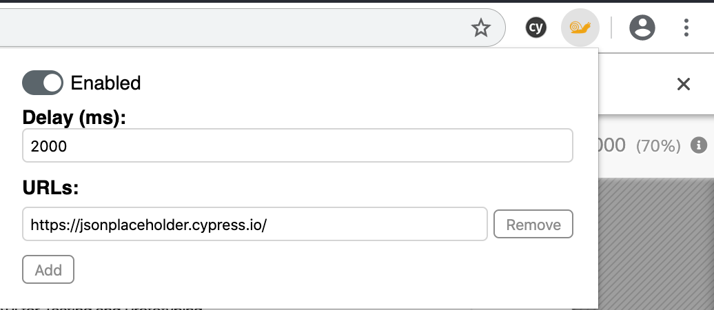 Once Chrome runs the test (under the test user profile Cypress creates), I open the Chrome extensions store and install the URL Throttler extension. I enable this extension and add https://jsonplaceholder.cypress.io/ URL to be slowed down by 2 seconds.