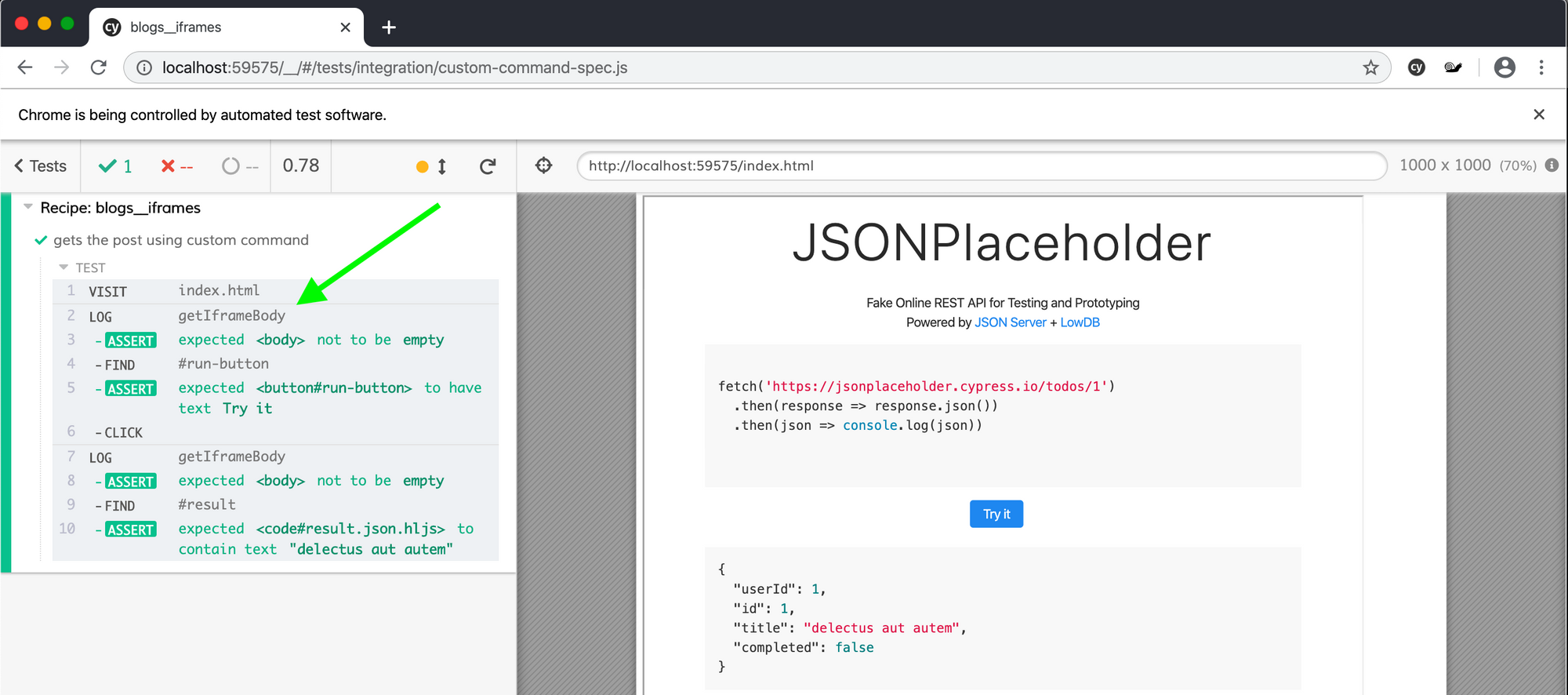 cy.getIframeBody().find('#result').should('include.text', '"delectus aut autem"')