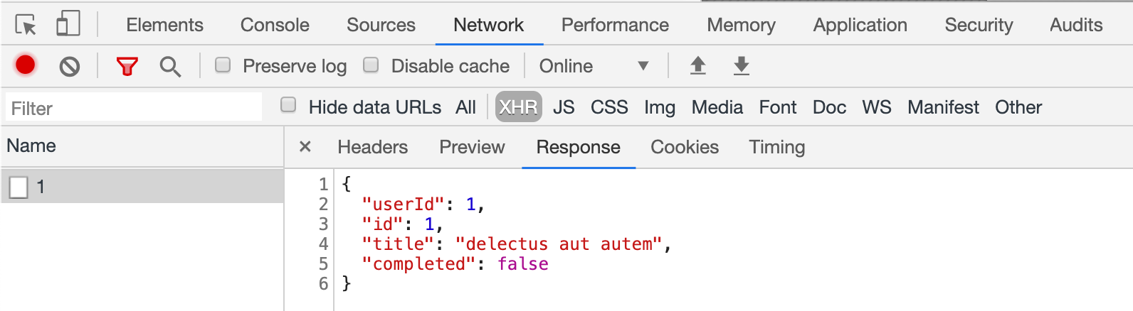 Relying on 3rd party APIs is less that ideal. Let's replace that call to /todos/1 with our own stubbed response. The XMLHttpRequest object has been copied after the page loads and the iframe is ready, let's use it to return an object.