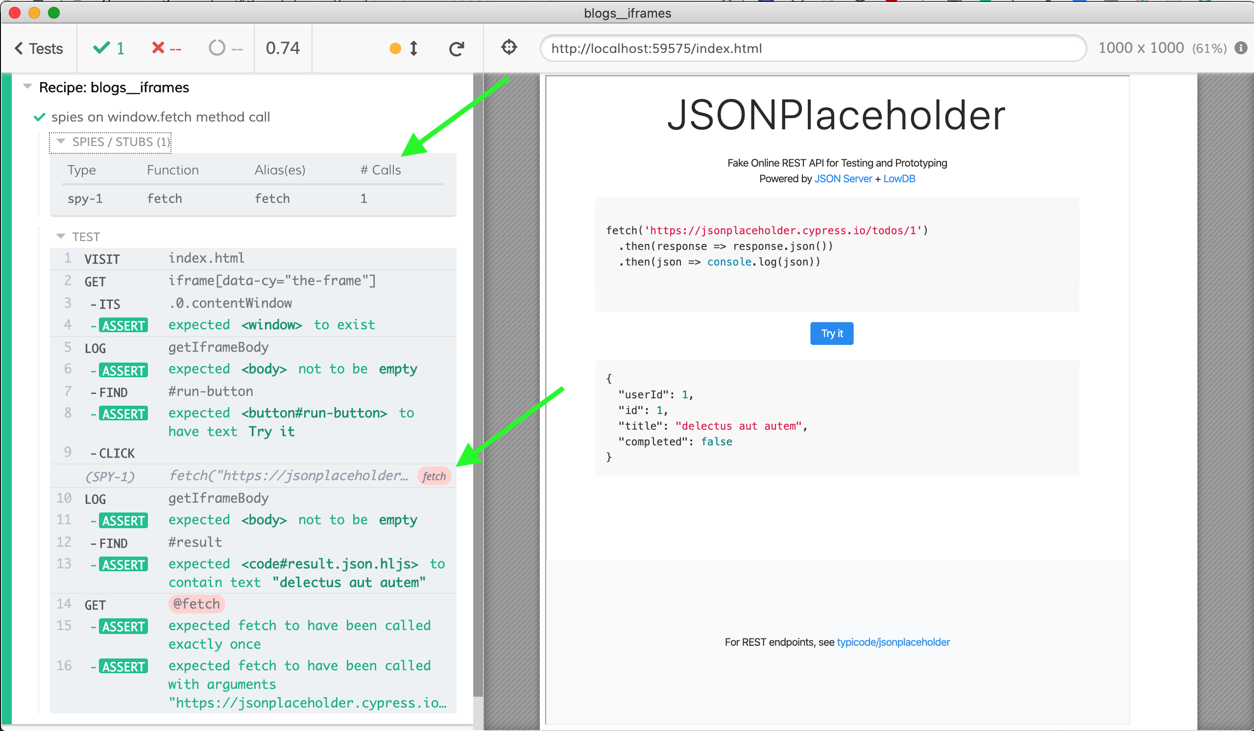 })We get an object window from the iframe, then set up a method spy using cy.spy(win, 'fetch') and give it an alias as('fetch') to retrieve the calls that go through that method later. We can see the spies and when they were called in the Command Log, I marked them with green arrows in the screenshot below.