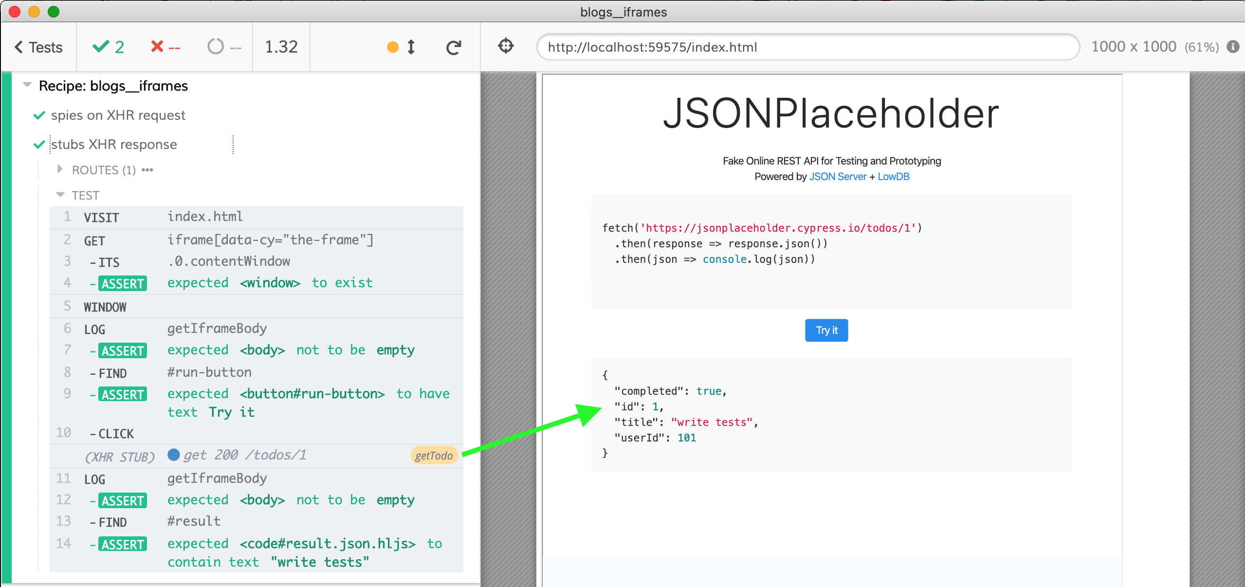 })Nice, cy.route with an object argument stubs the matching network requests, and our assertions confirm that the iframe shows the text "write tests".